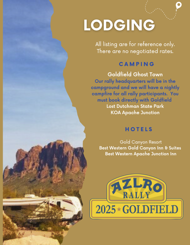 GoldField Camping call – 480-740-4481 Lost Dutchman State Park – WEBSITE KOA – Apache Junction – WEBSITE Best Western – WEBSITE Gold Canyon – WEBSITE