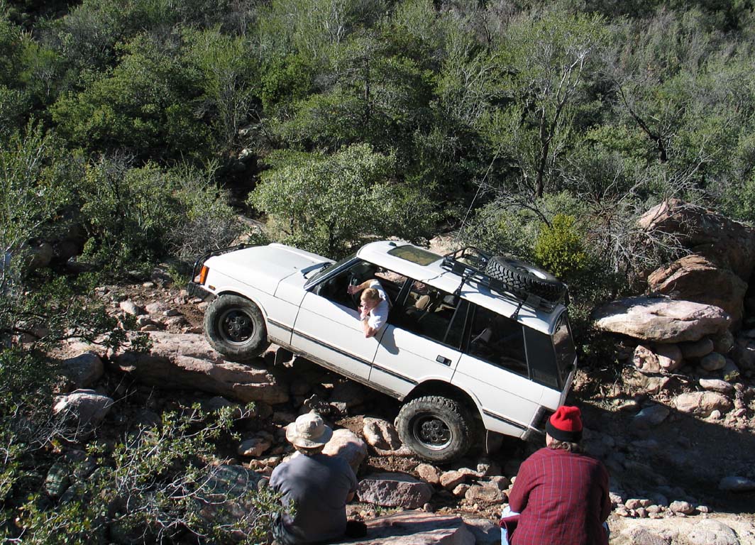 Jon Katz's Range Rover climbs a rock.