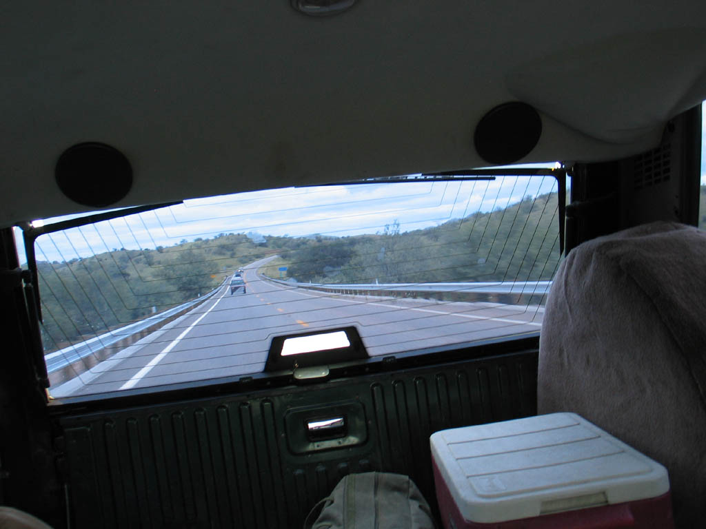 A Dicovery is seen through the back window.