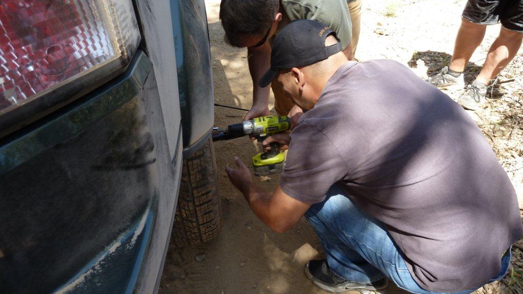 Bill shows all the boys the merits of carrying power tools on the trail!