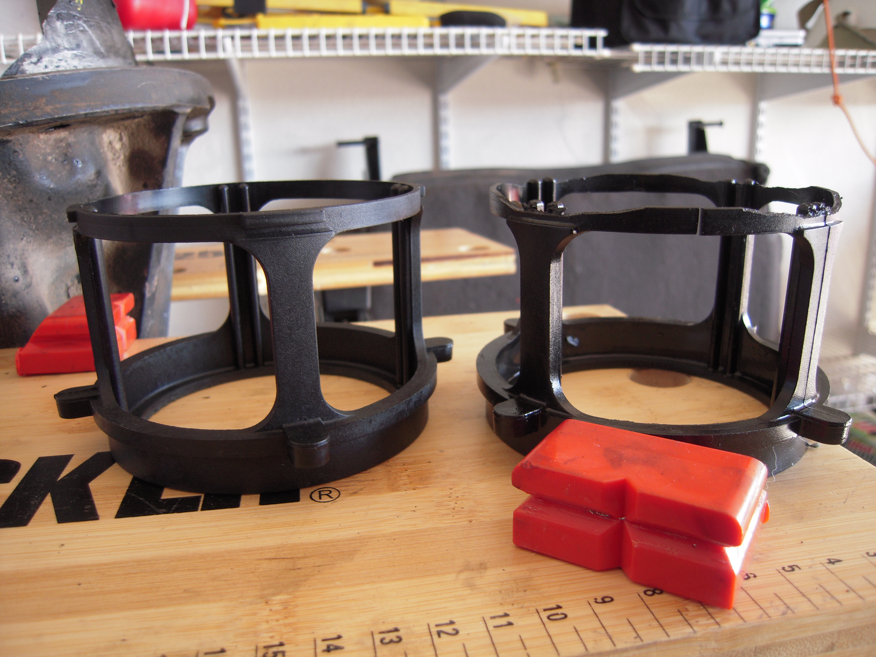 This photo compares the broken piston to the replacement part.